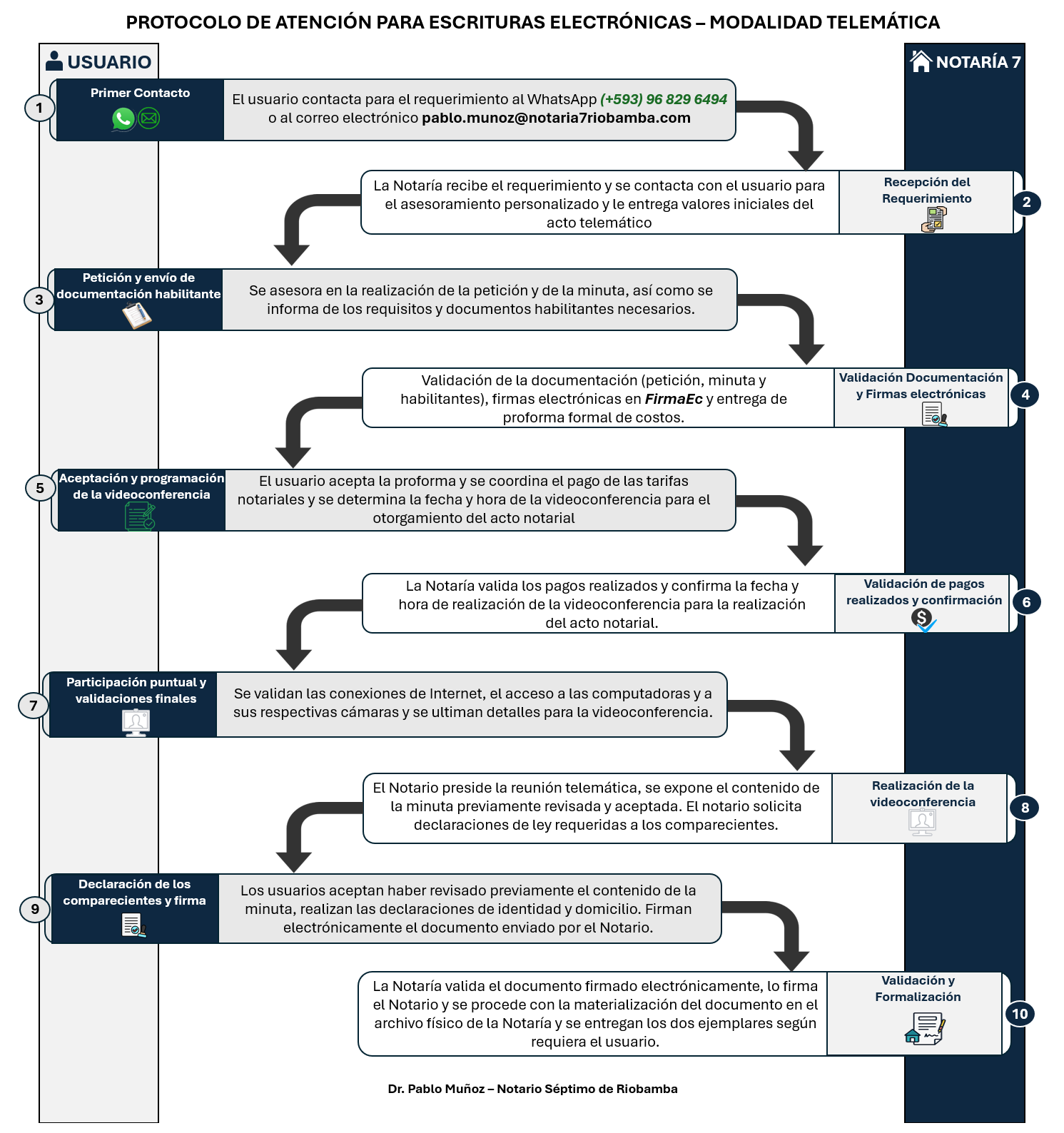 En la Notaría Séptima de Riobamba, estamos comprometidos con la innovación y la satisfacción de nuestros usuarios. Por eso, ofrecemos un servicio notarial electrónico en modalidad telemática, que te permite gestionar tus trámites de forma remota, garantizando la misma seguridad y eficiencia que en nuestros servicios presenciales.